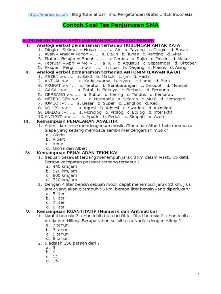 Jun 30, 2021 · untuk menghadapinya, detikers bisa melatih diri dengan mengerjakan contoh soal tes peminatan jurusan ipa sma, lho. Hudha dan buku 'prediksi soal masuk sma favorit ipa' karya adjie satryo, berikut ini contoh soal tes peminatan jurusan ipa sma beserta kunci jawabannya. Jan 28, 2021 · contoh soal tes psikotes sma jurusan ipa | kumpulan materi … Terima kasih telah berkunjung ke blog contoh soal terbaru 2020. Biar lolos, ada contoh soal tes masuk sma yang bisa dipelajari.
